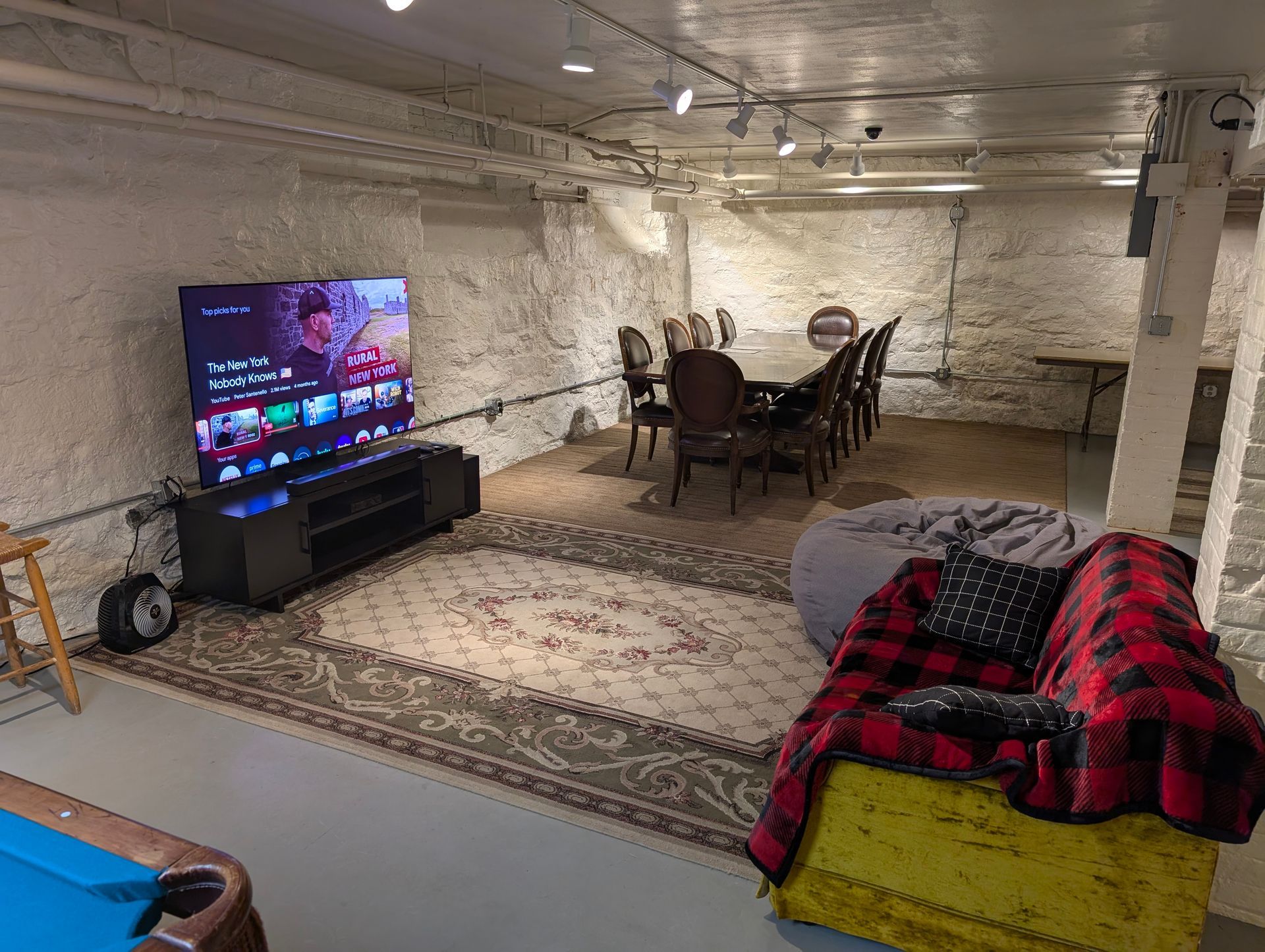 Guests are invited to make themselves at home at Prescott House ADK! There's a shared kitchen and dining area in the basement, located adjacent to "SLK's" our aviation-themed recreation area. SLK's Fixed Basement Operations includes a pool table, retro-arcade game with 50+ games, large-screen OLED TV and a board-room style table for gaming or shared meals. Coming soon - Brand new Stern Dungeons & Dragons themed pinball machine!
